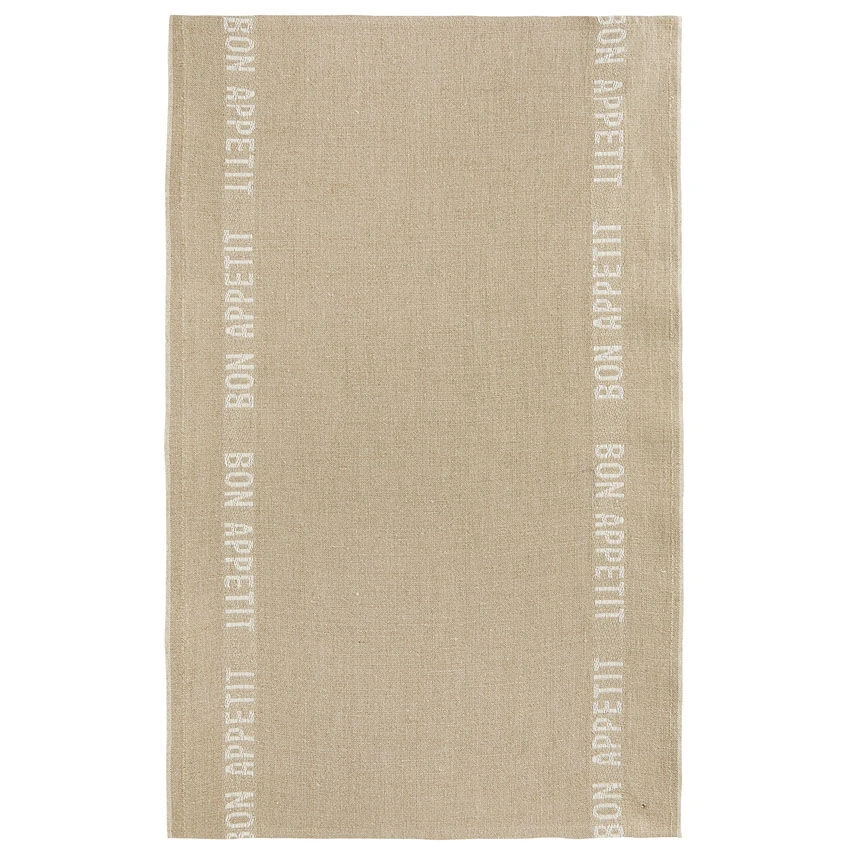 De Charvet BON APPETIT theedoek is vervaardigd uit 100% linnen. De theedoek is geweven in een beige kleur met aan beide zijde in het wit de tekst: BON APPETIT. De doek is 75 cm lang en 45 cm breed. Gebruik voor het drogen van uw afwas.